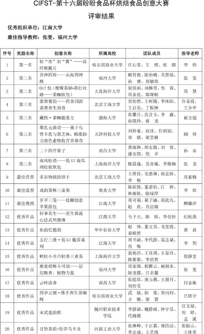 本届大赛由中国食品科学技术学会(CIFST)主办,以“盼享美味,健康+焙”为主题,旨在挖掘和培育食品工业创新人才。自今年4月启动以来,大赛共收到来自全国20余所高校的近200份创意计划书。经限额推荐、初赛评审,40份作品入围复赛。经业内专家评审,最终评选出20份优秀作品。
