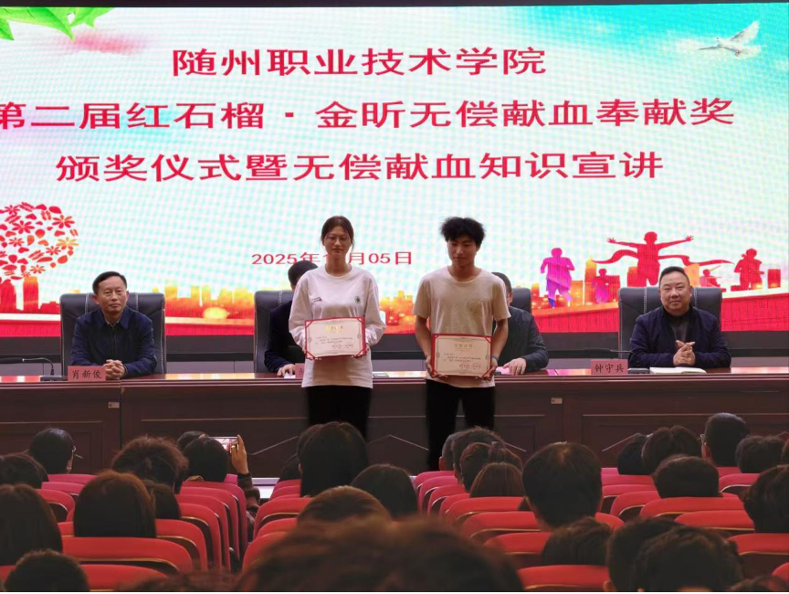 11月5日下午,随州职业技术学院在学术报告厅举行第二届“红石榴·金昕无偿献血奉献奖”颁奖典礼暨无偿献血知识宣讲活动。学校党委委员、副校长邹厚亏,随州市中心血站副站长吴大奎,党委宣传(统战)部、学生工作处、校团委等部门负责人,各二级学院党总支副书记、团总支书记,15名受表彰学生及无课班级学生代表参加活动。