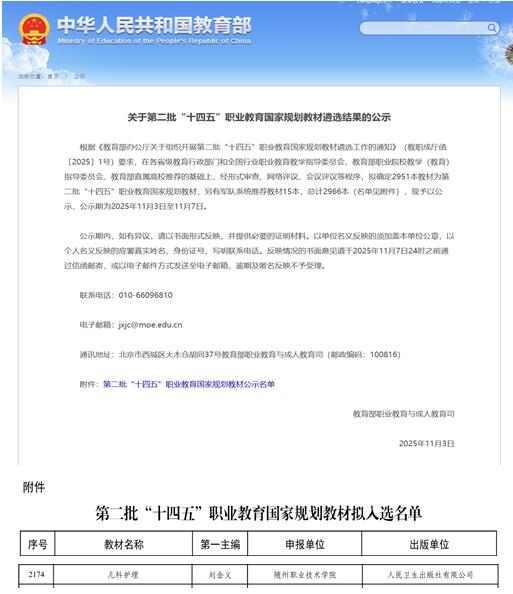 近日,教育部办公厅公布第二批“十四五”职业教育国家规划教材入选名单,我校护理学院刘金义老师主编的《儿科护理》教材成功入选。这是我校在国家级高水平教材建设领域取得的一项重要突破。